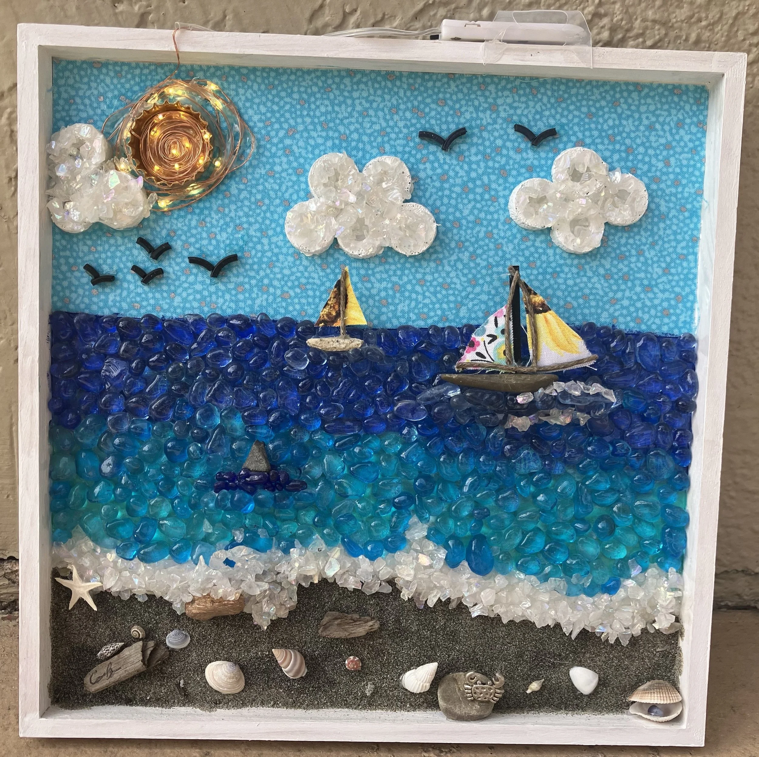 A Day On The Seashore - 2025Mixed media on wood. Constructed of upcycled materials, sand, stones, shells, fabric, and string lights.