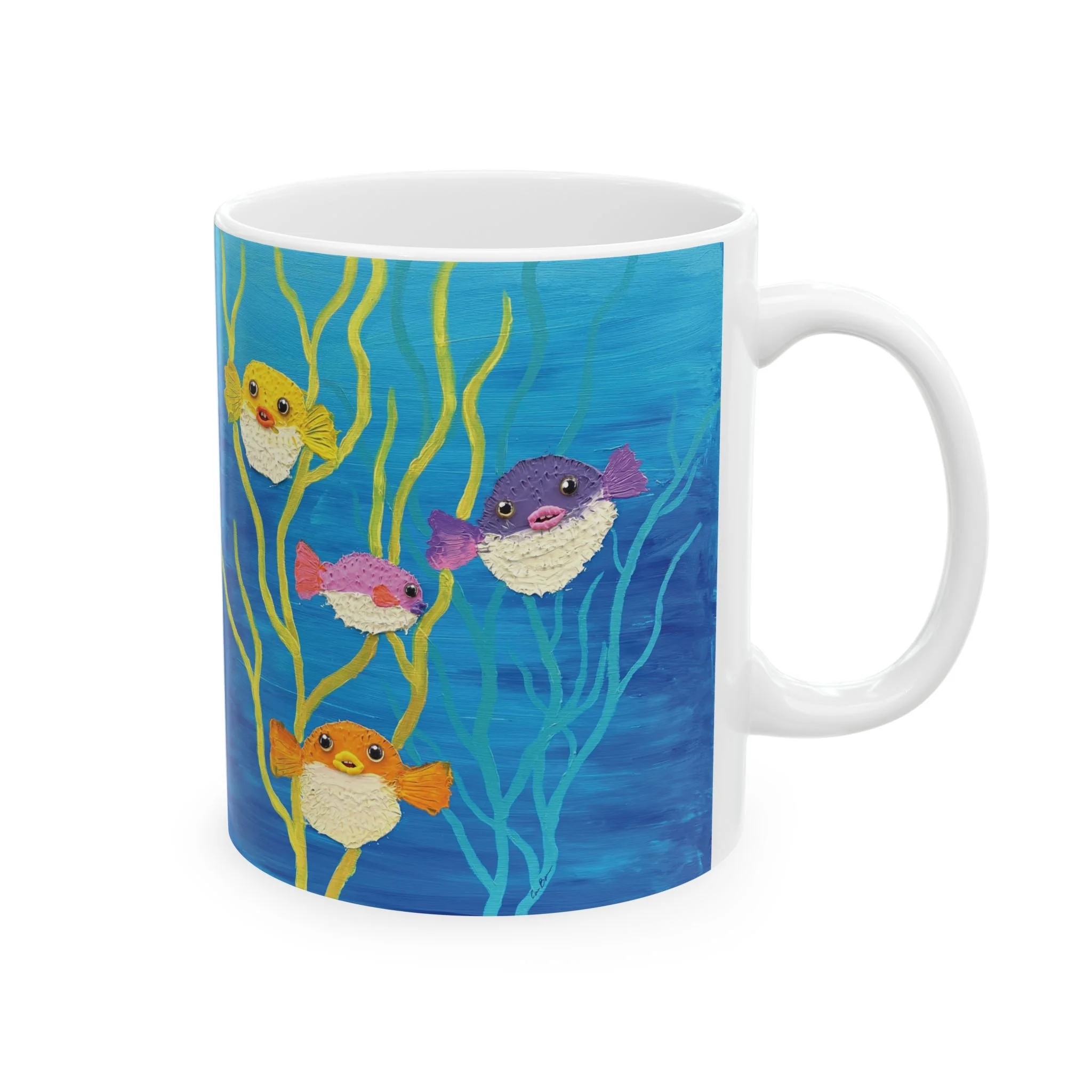 These brightly colored blowfish pop out from a brilliant blue sea. Cute and fun, they'd love to share a cup of coffee or tea!